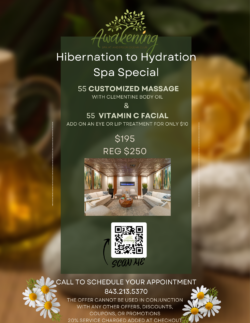 Regular relaxation is a part of a healthy and happy lifestyle. Through self-care, we are able to engage in life again – to awaken. We invite you to experience your own personal awakening at our Myrtle Beach spa. Our soothing treatments range from anti-aging facials to therapeutic massages and hydrating body treatments. Whether your desire is some “me-time” or a little ‘we’-time, call us today to plan your self-care escape at Awakening Spa.
